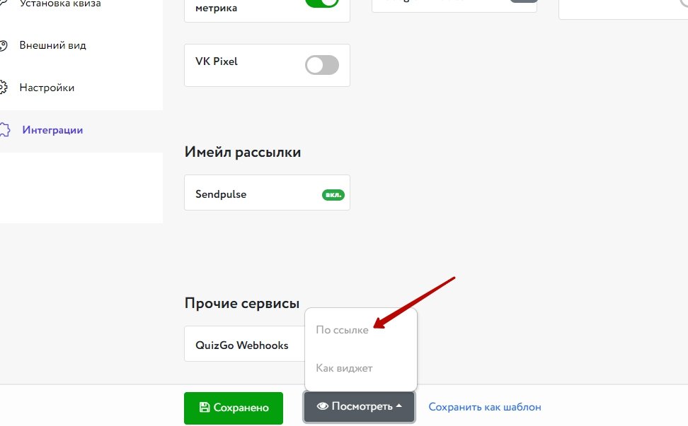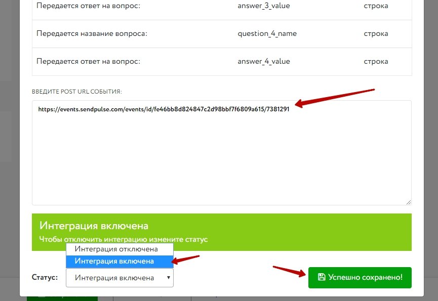 Перейти на QuizGO и вставить скопированную ранее ссылку в поле POST URL СОБЫТИЯ под переменными и выбрать статус "интеграция включена"