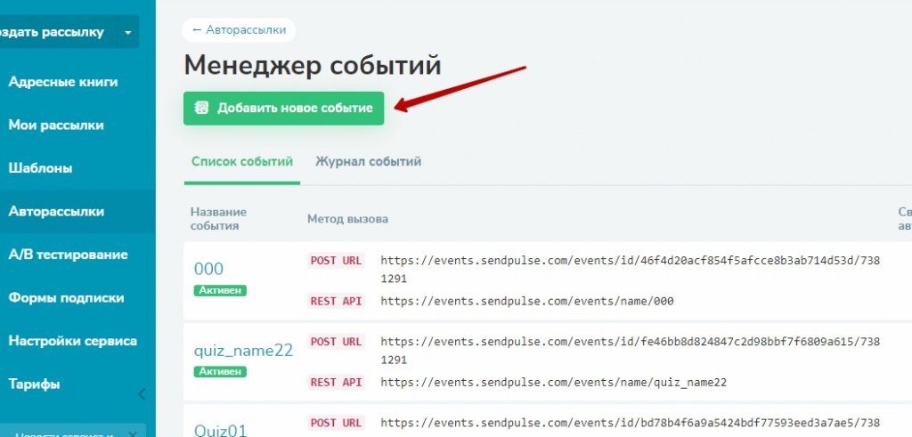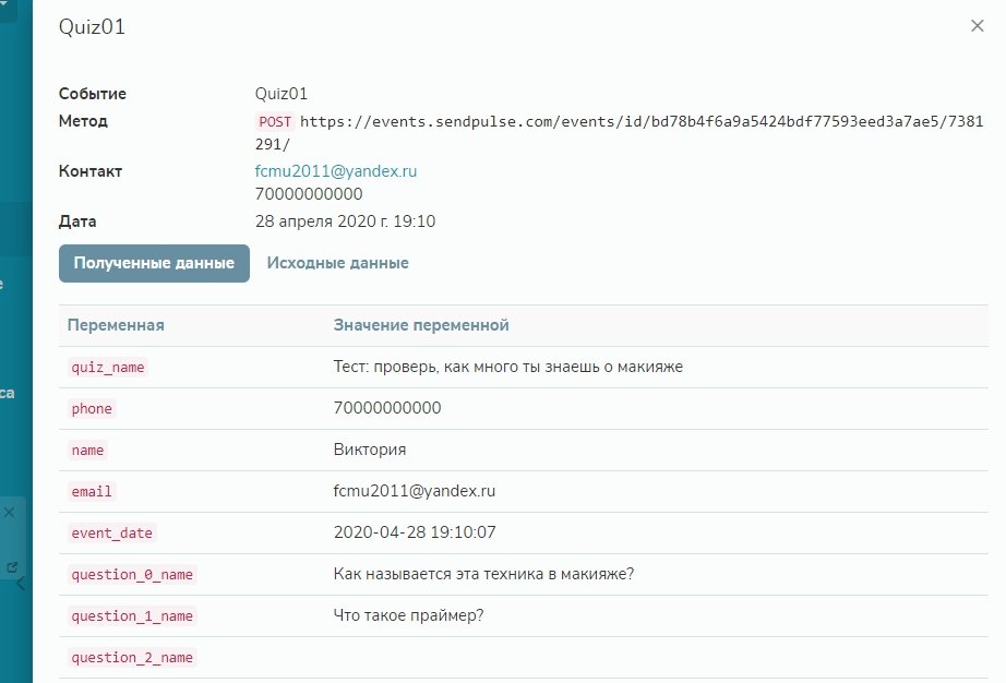 Далее перейти в SendPulse/ "авторассылки"/"менеджер событий"/"журнал событий". В журнале событий выйдет лид из QuizGO с полной информацией о переменных