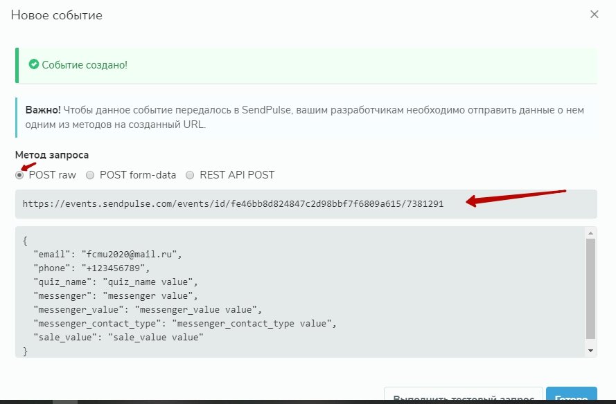 Переместив все желаемые переменные в SendPulse,выйдет окно с созданным событием и с ссылкой на это событие. Данную ссылку необходимо скопировать и убедиться,что в методе запроса выбран POST raw