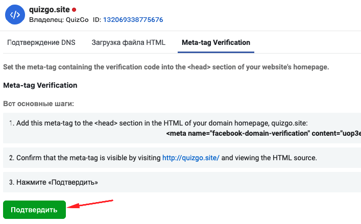Переходим на Facebook и нажимаем кнопку подтвердить домен.