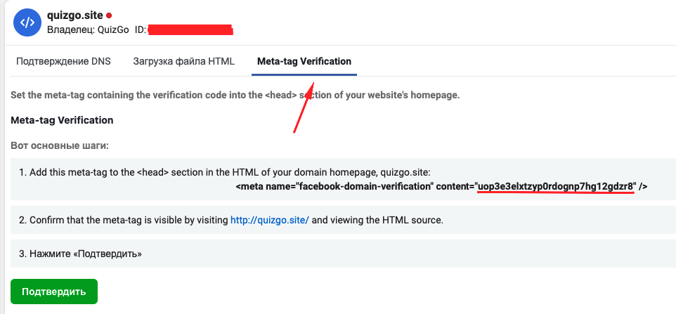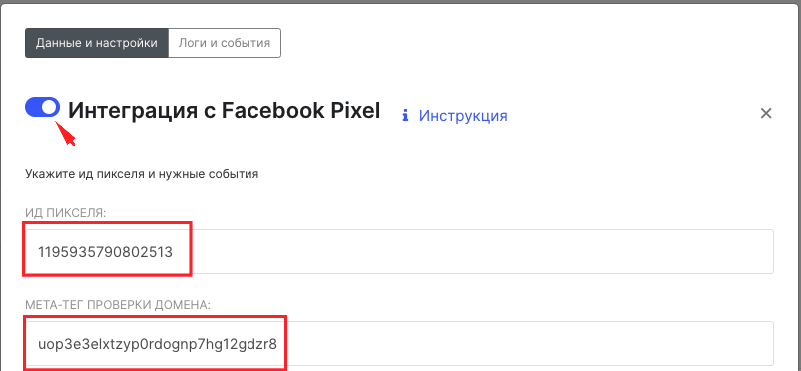 Убеждаемся что FB Pixel включен, введен ИД пикселя и вводим код в поле мета-тег проверки домена, который только что скопировали.