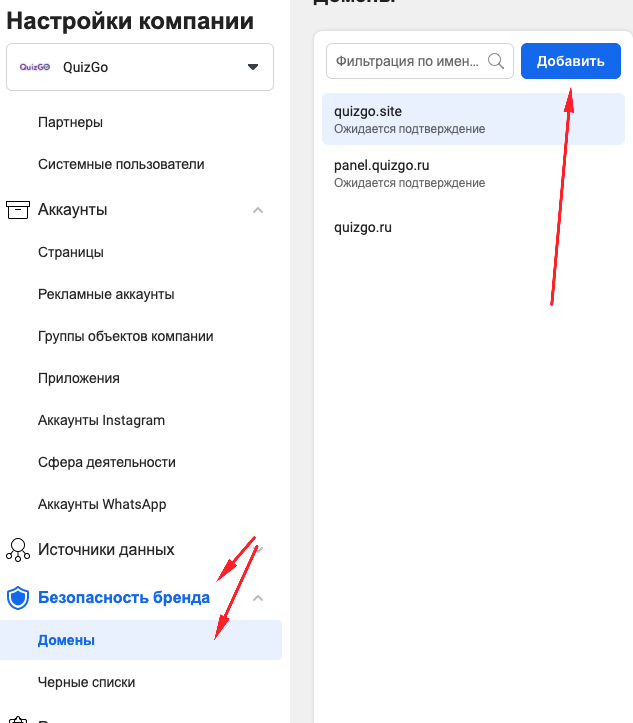 Домен успешно привязали, квиз открывается по вашем домену, далее перейдем в настройки компании:Переходим в раздел Безопасность бренда - Домены и добавляем новый домен