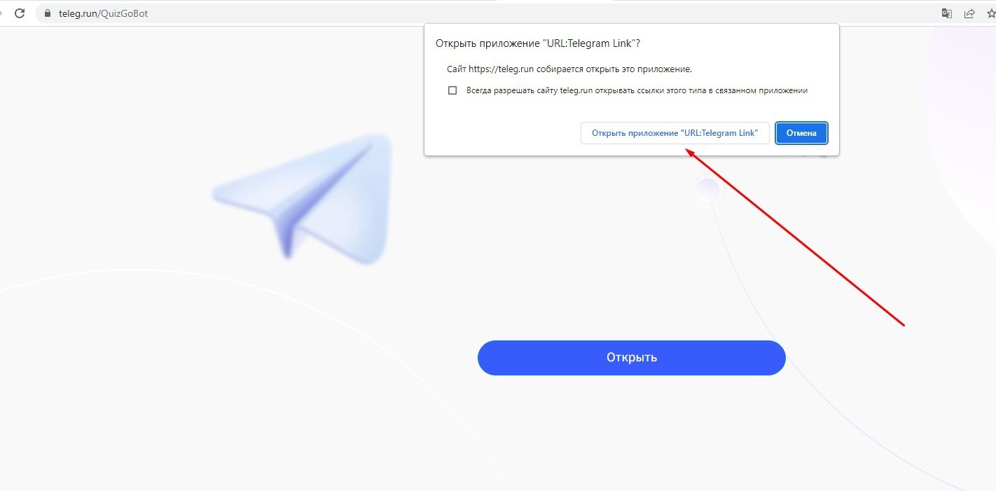 После того,как вы перешли в приложение Телеграм,в диалоге нажать кнопку "запустить"