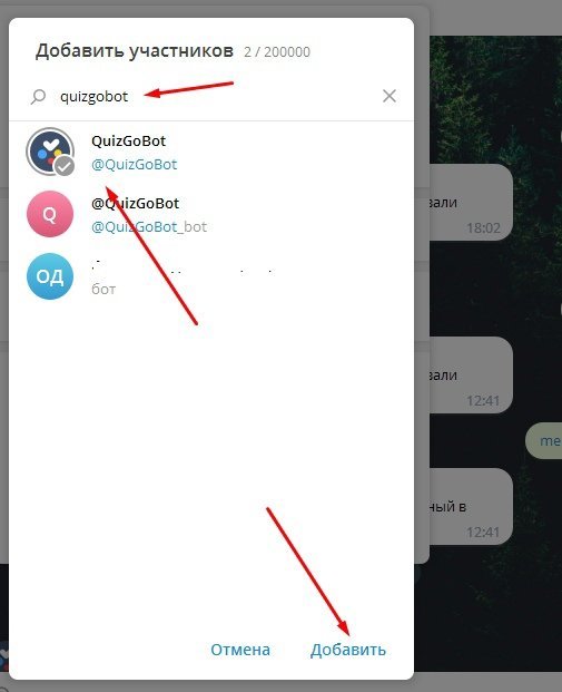 Для того,чтобы добавить бота в группу, нужно выбрать группу и нажать "пригласить участника". Далее находите бота, добавляете в группу и настраиваете его через команду /add.