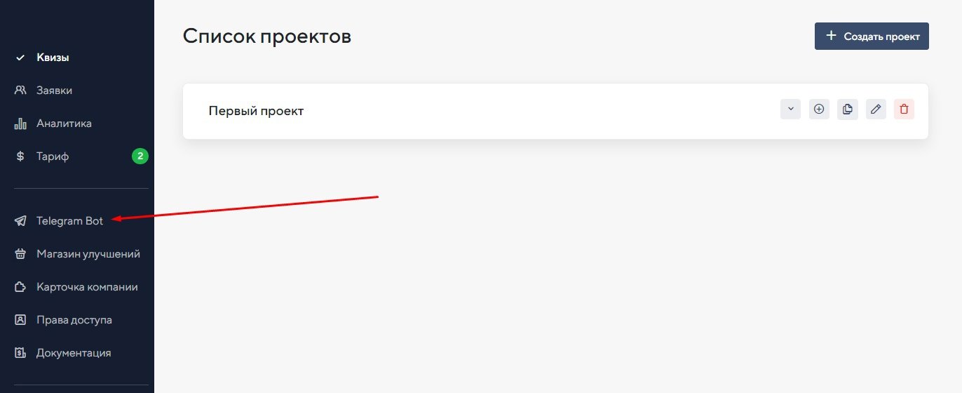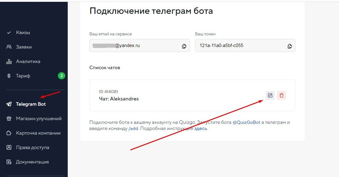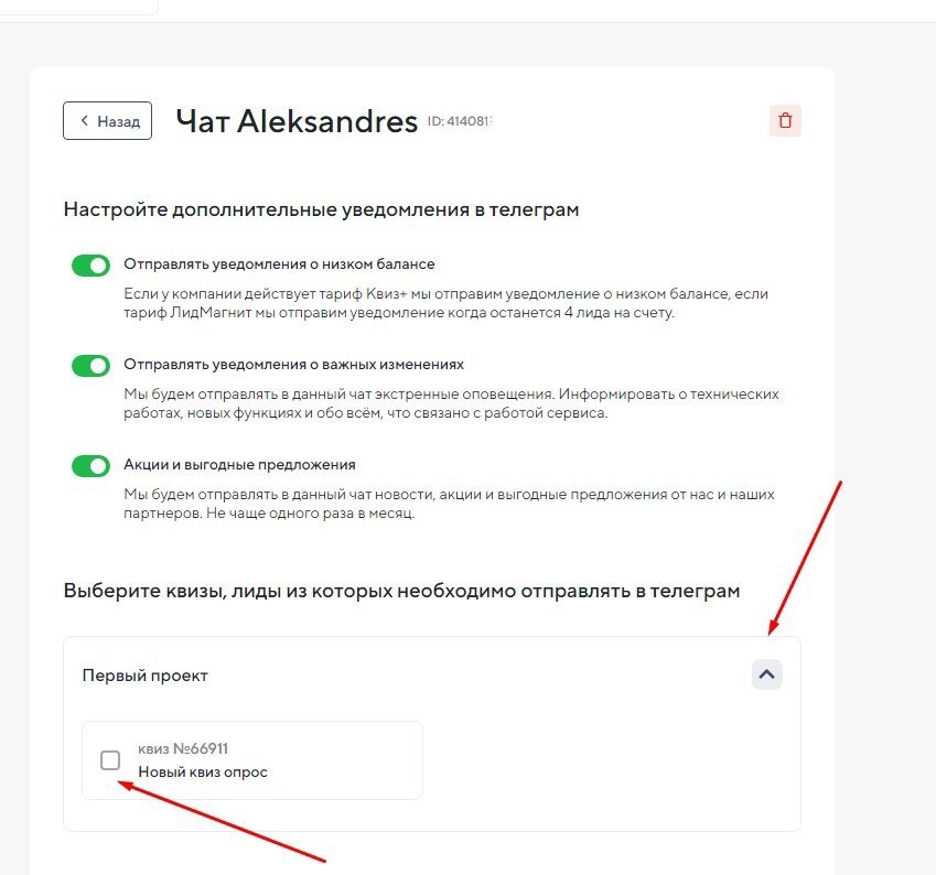 Далее переходим в настройки созданного чата и выбираем квизы из которых хотите получать заявки в этот чат