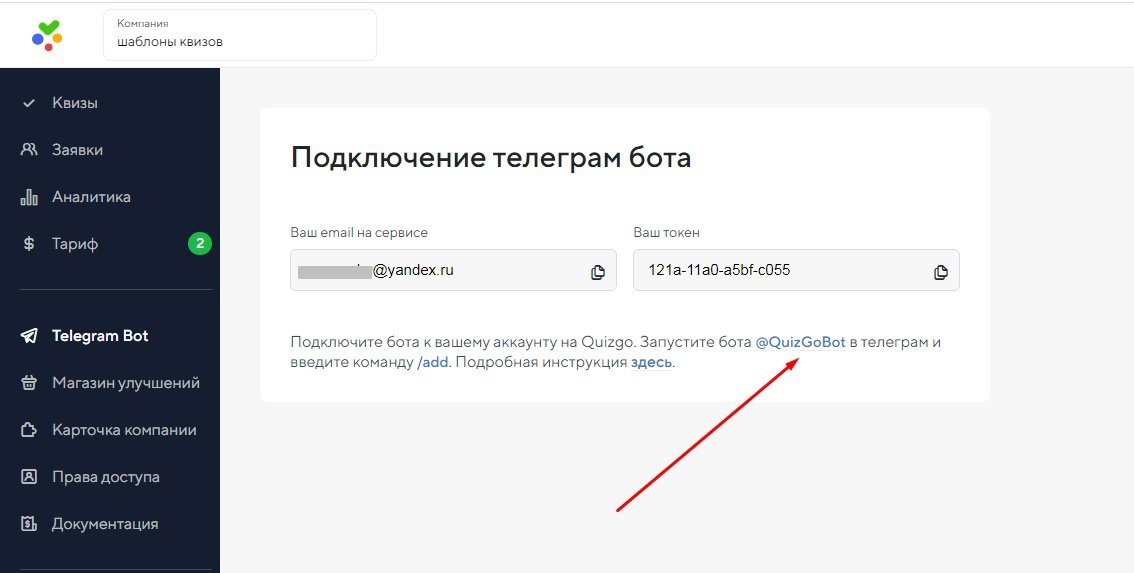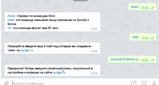 Далее бот запросит ввести имэйл, необходимо вводить в точности, как у вас в аккаунте в QuizGo, чтобы телеграмм бот видел вас.