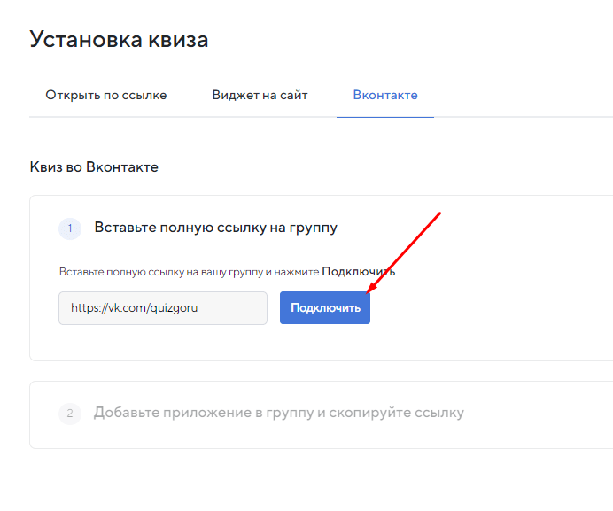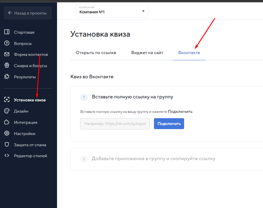 Далее заходим во вкладку "Установка квиза" и там выбираем "Вконтакте"