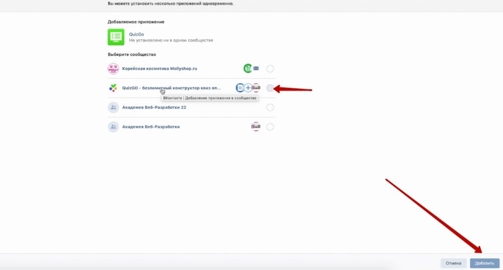 Далее вы выбираете группу в которой хотите добавить приложение и нажимаете "добавить"