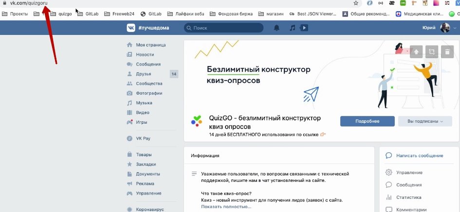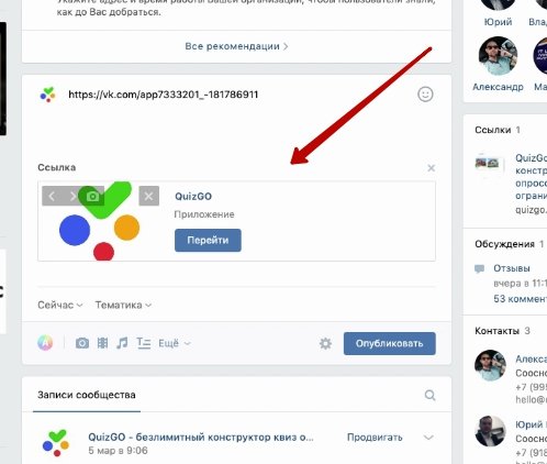 Для того, чтобы поместить ссылку на квиз с призывом пройти его,вам нужно скопировать ссылку в сервисе QuizGo и поместить эту ссылку на стену вашей группы