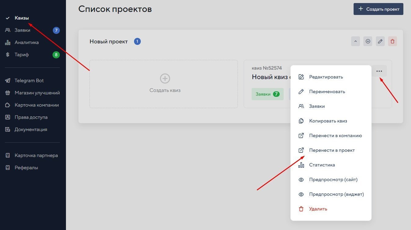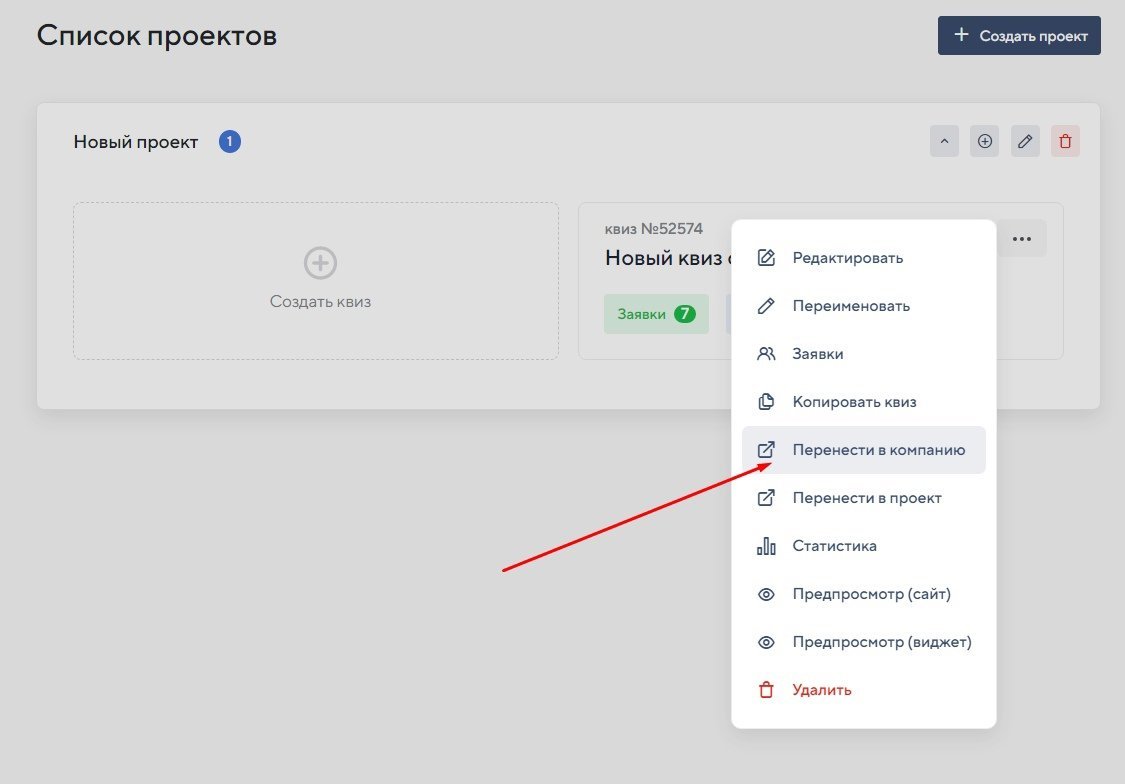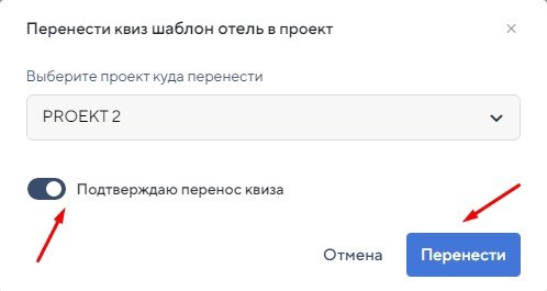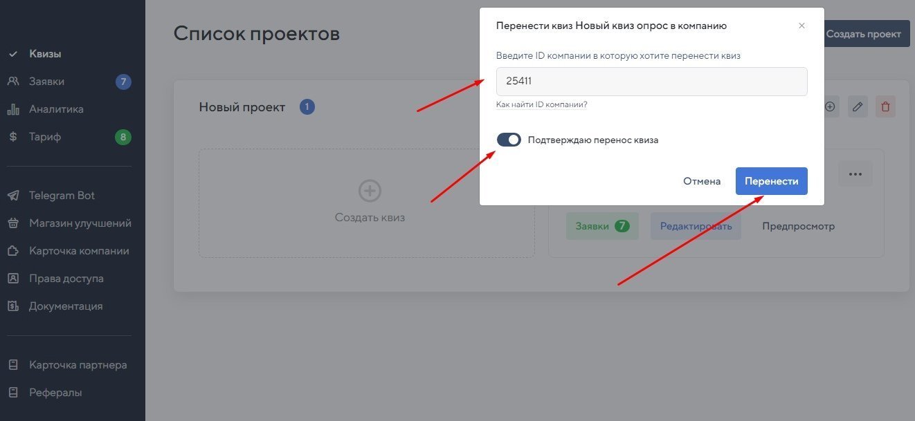 Далее вводим ID компании куда хотим перенести квиз и активируем ползунок и жмем на кнопку "Перенести"