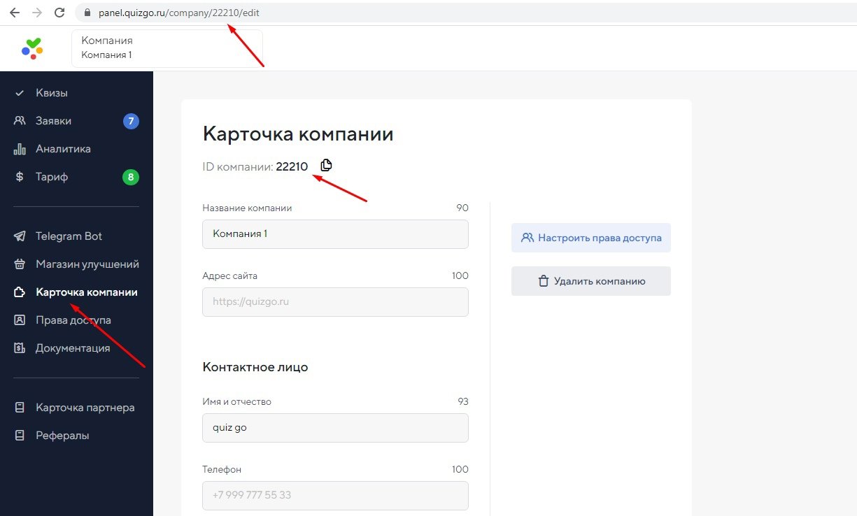 ID компании куда переносим квиз можно узнать нажав на вкладку «Карточка компании» либо в адресной строке нужной компании