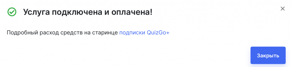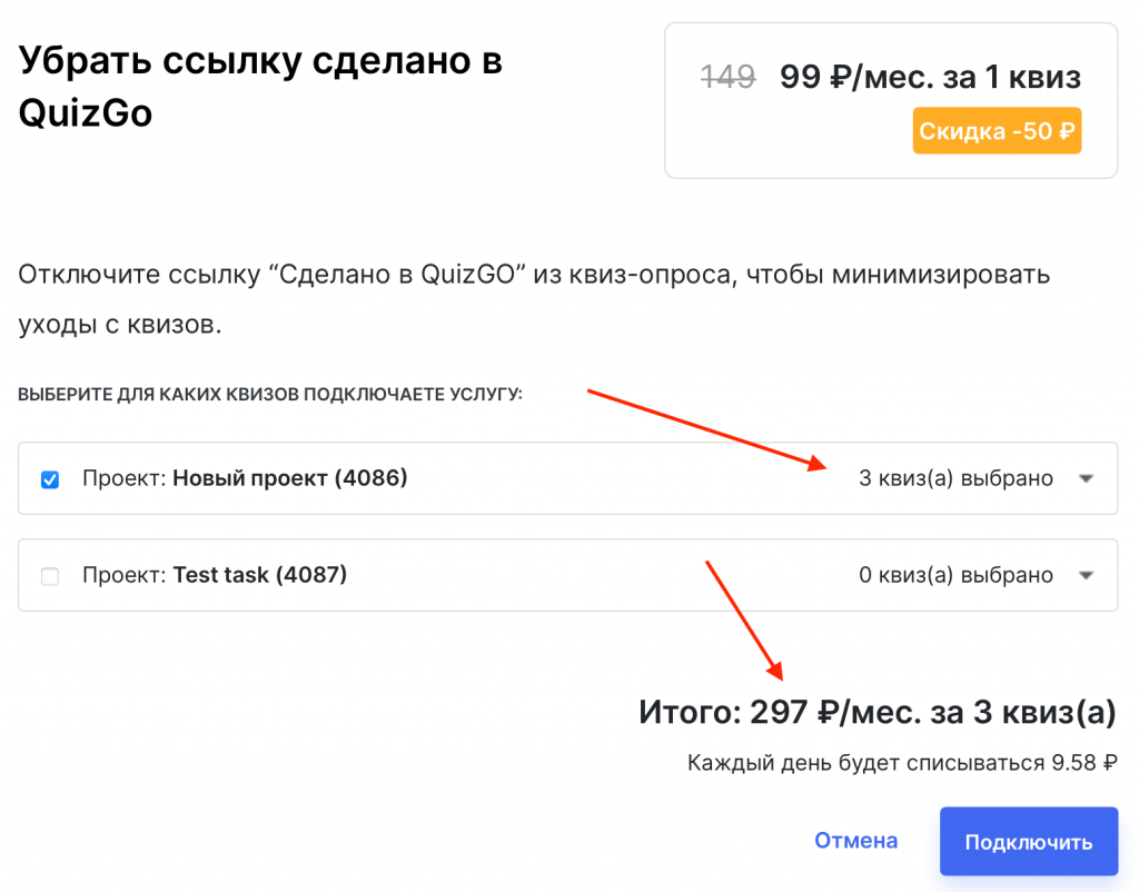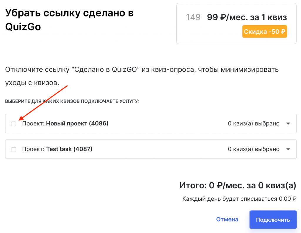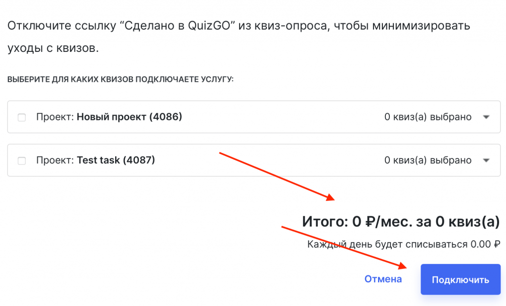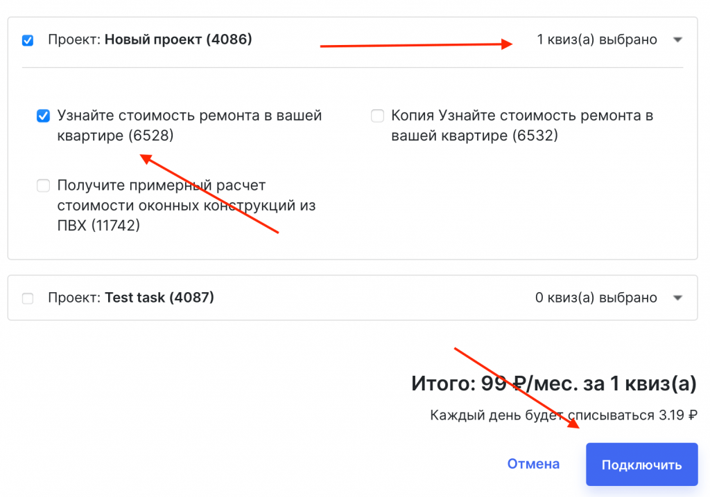Поставив флажок в левом углу, вы отметите сразу все квизы в вашей компании к которым будет подключена услуга